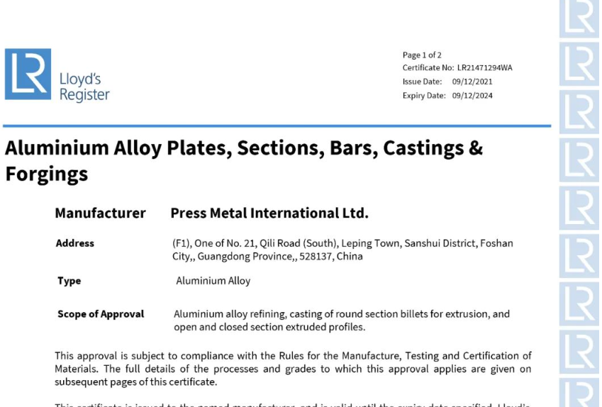 澳美鋁業獲得英國勞氏船級社工廠認可證書